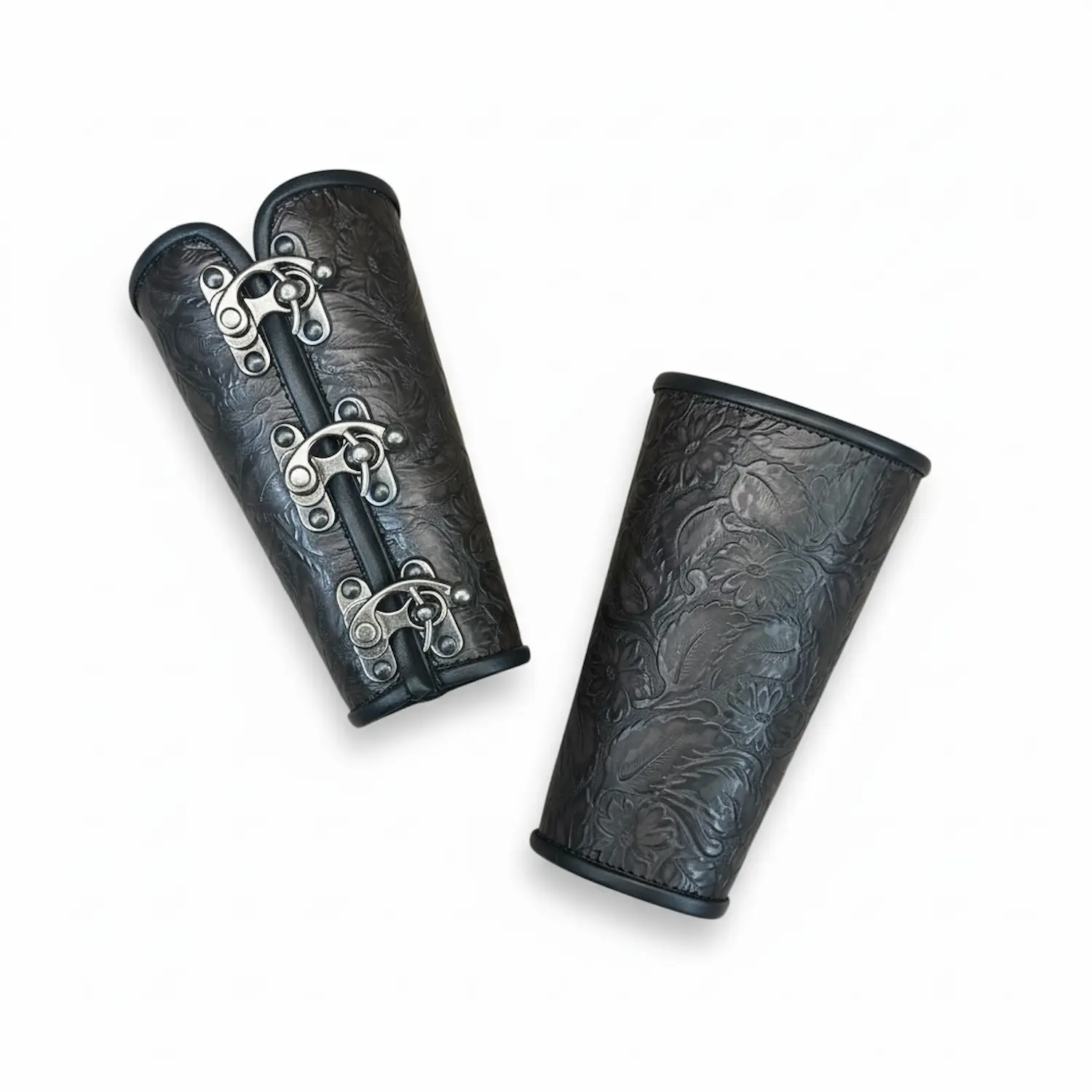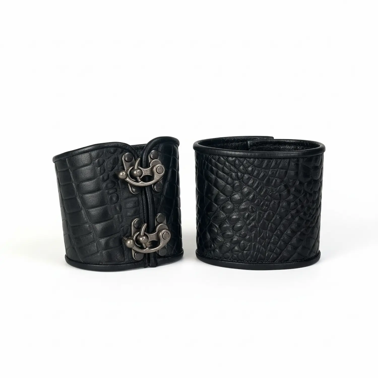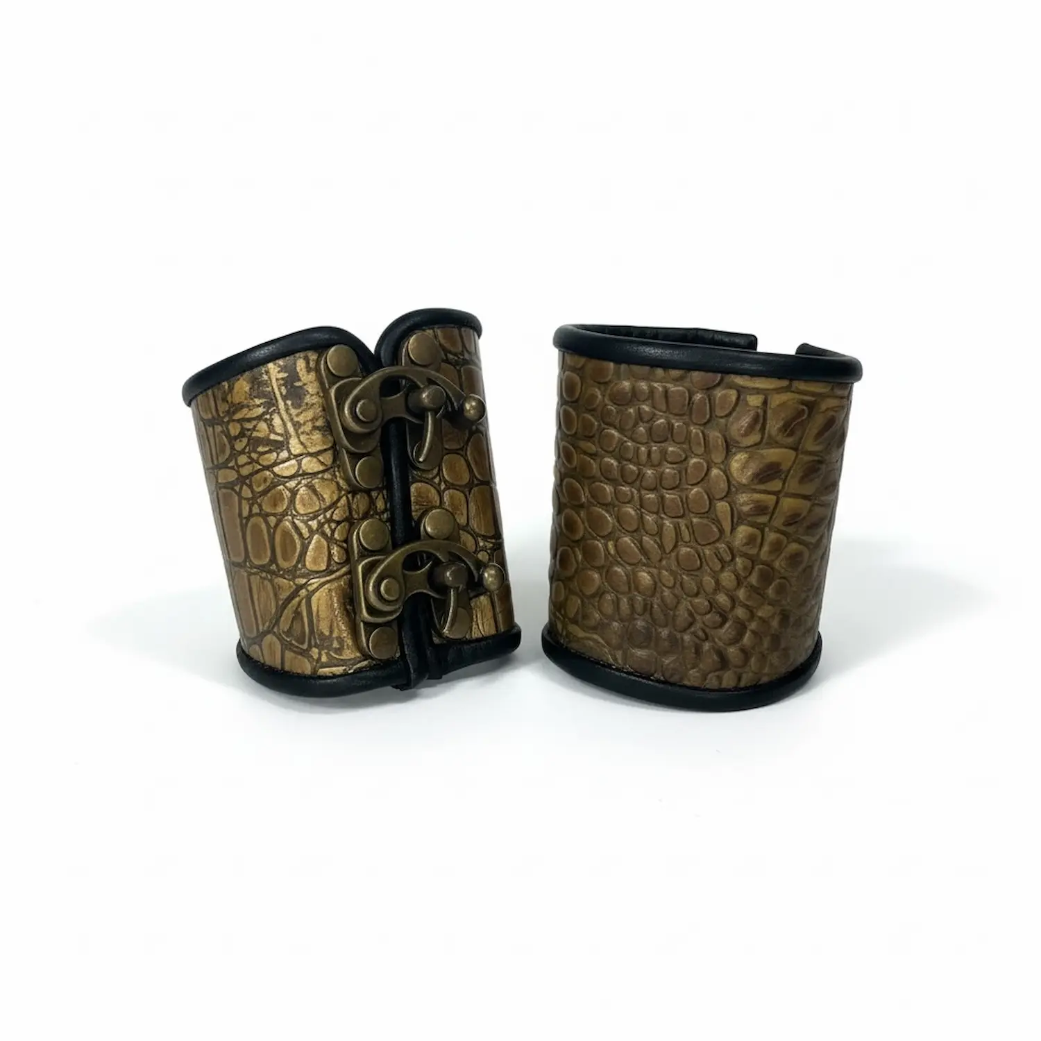 Our 3-clasp bracers feature a bolder silhouette that highlights the character of our specialty hides. A single 3-clasp bracer starts at $45, with additional costs for larger sizes.